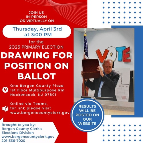 Please join the Bergen County Clerk on Thursday, April 3rd at 3pm as he draws for positions on ballots for the June 10, 2025, Primary Election.